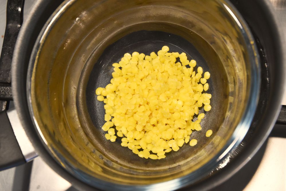 – Dans le bol, versez puis faites fondre la cire d’abeille au bain-marie en veillant à ne jamais faire bouillir l’eau afin de ne pas dégrader les ingrédients ; l’idée étant bien de faire fondre les ingrédients et non pas de les cuire !