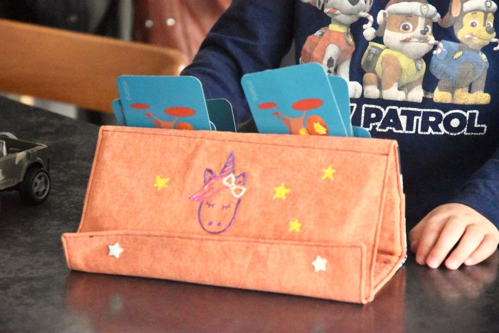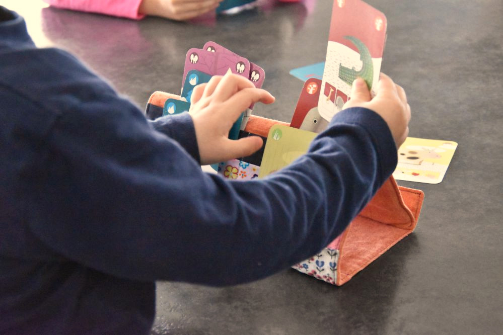 Les familles sont composées de quatre personnages, ce qui favorise les parties rapides et permet aux petites mains de mieux tenir les cartes, même si à la maison nous avons un porte cartes (crée par Tata Couture) qui permet à Petit Chat d’avoir les mains libres pour jouer. Mais il existe aussi (toujours chez Djeco) un porte carte très pratique !